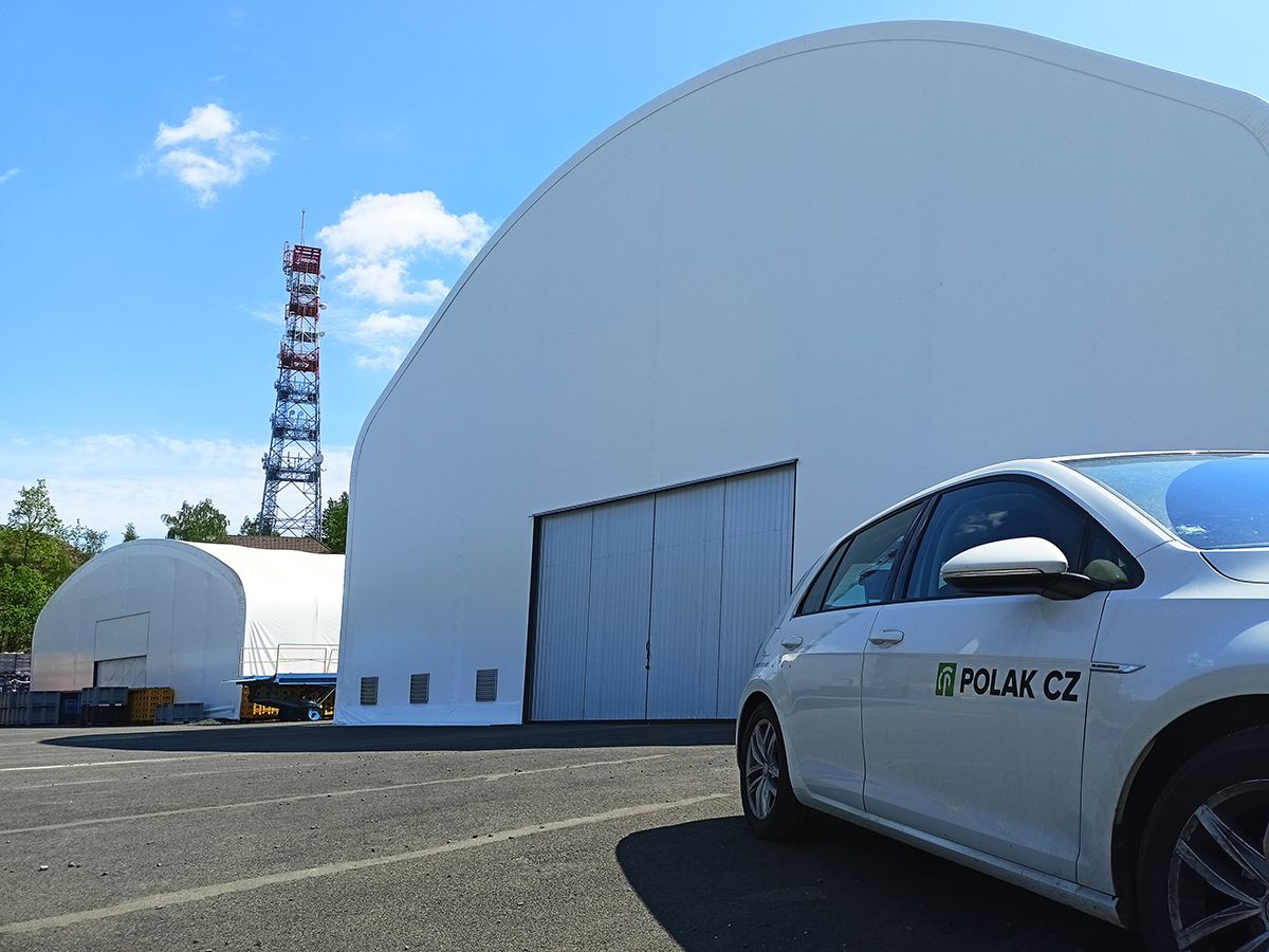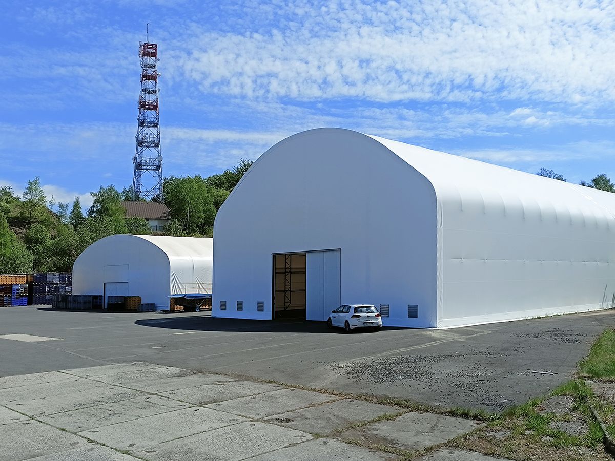 Die Halle wurde auf einem bestehenden Asphaltuntergrund errichtet, ergänzt um Maßnahmen gegen das Eindringen von Wasser in die Halle. An Front und Seite der Halle sind zweiflügelige Schiebetore installiert. Die Hallenverkleidung besteht aus weißer Textilie mit einem Flächengewicht von 900 g/m².