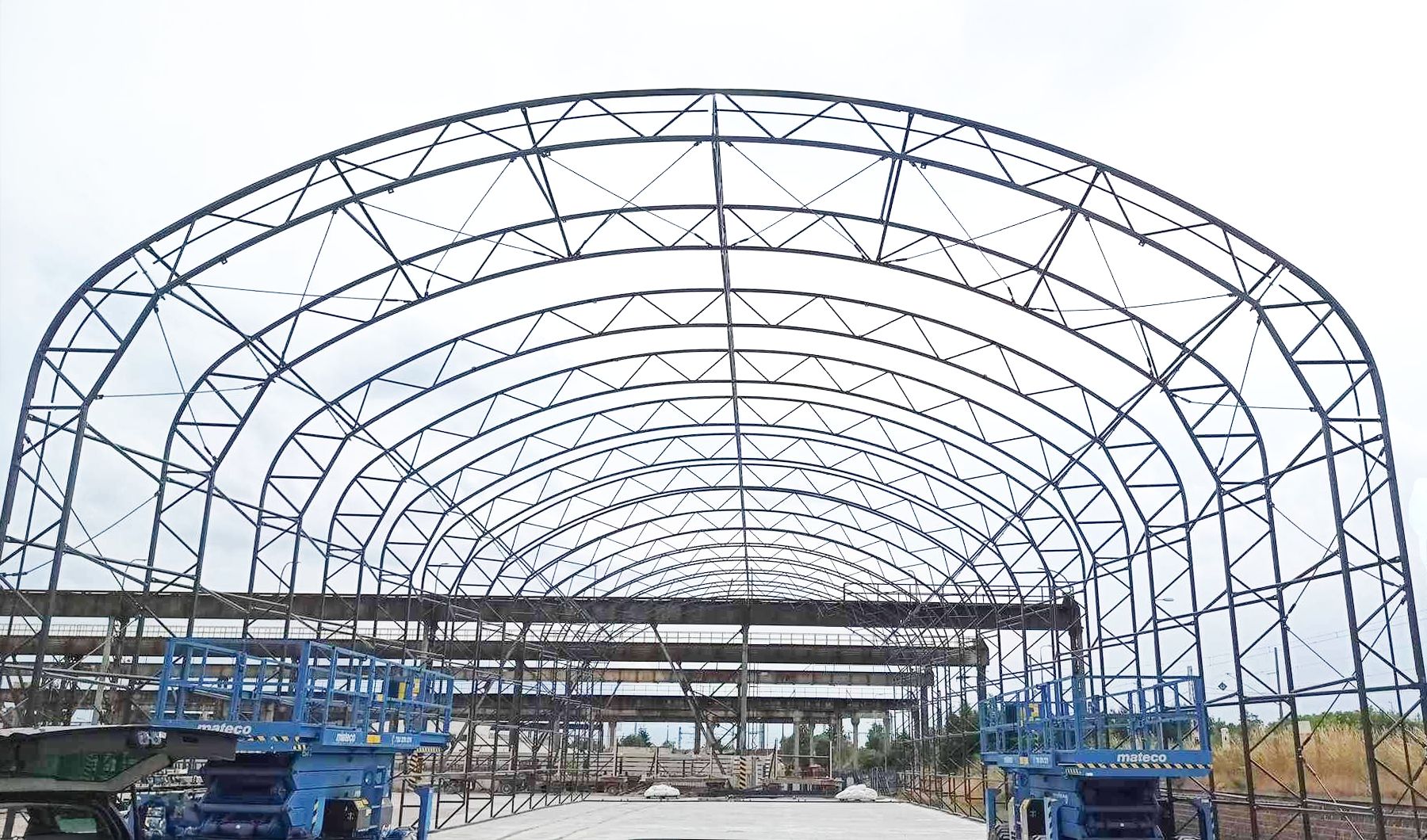 | Konstruktionstyp der montierten Halle | UT-Halle mit stählerner Fachwerkkonstruktion und halbrundem Dach |