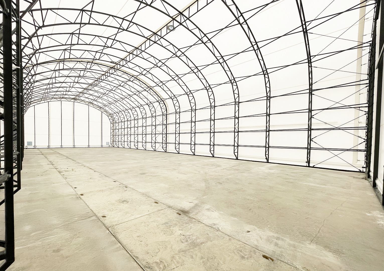 Die Konstruktion besteht vollständig aus Stahl. Die montierte Halle wurde auf einem Betonuntergrund errichtet; an der Hallenfront befindet sich ein Schiebetor. Die Verkleidung besteht aus hochbeständiger technischer Textilie. Die Halle befindet sich in der Schneelastzone II. Als Zubehör sind Lüftungsöffnungen und Beleuchtung vorgesehen.