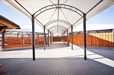 Der Tunnel verbindet die Stallungen mit der Reithalle. Verläuft zwischen dem Karussell und der kreisförmigen Reithalle.